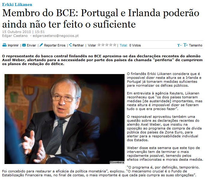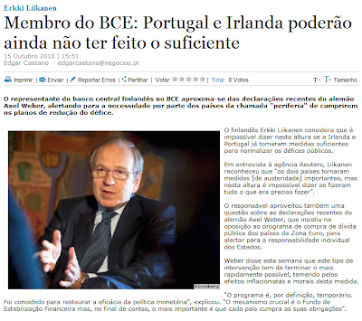 “O PSI-20 encontra-se a negociar em terreno negativo depois do rompimento das negociações do Orçamento de Estado tornada pública esta manhã por Eduardo Catroga e pelo Ministro das Finanças, Teixeira dos Santos, com consequente subida de 20 pontos base para 5,781% na “yield” da dívida portuguesa a 10 anos.” (Jornal de Negócios)